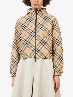 A lightweight jacket patterned with the Burberry Check cut to a regular fit. The hooded design is appliquéd with our Knight stamp an archival motif first seen on Burberry bags in the 1980s. Two-way zip closure Drawcord hood and hem Side zip pockets Elasticated cuffs Appliquéd Equestrian Knight Design at sleeve Comes with a garment bag Regular fit. Fits true to size take your normal size. Length: 61.3cm/24.1in (size UK M) Models height: 177cm/5ft 10in. Model wears size UK M 100% polyester Specialist dry clean Imported
