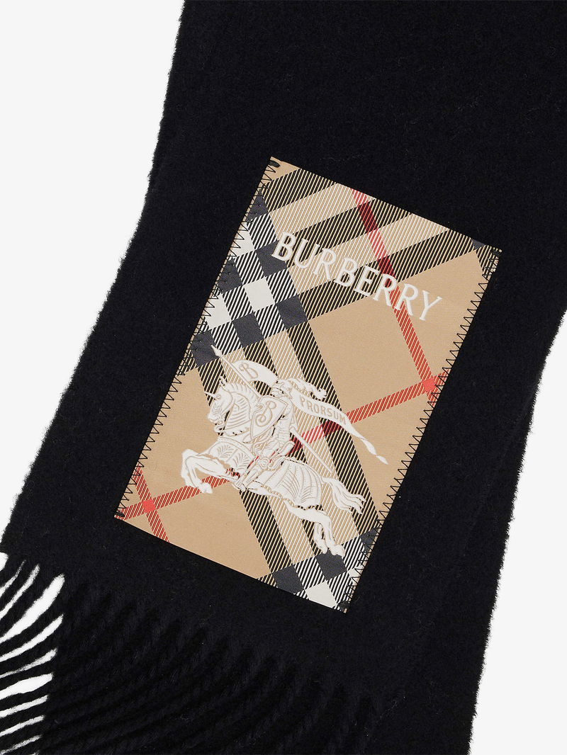 Burberry cashmere scarf. Check label, fringed trims, brushed texture, logo patch.
