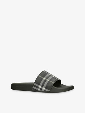 Burberry slides. Embossed Burberry lettering at side, check pattern, flat heel.