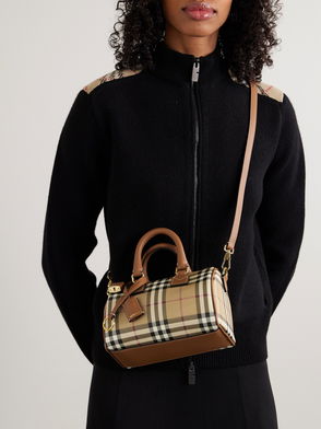 Tote shape, twin flat handles, check-engraved closure and D-ring hardware, detachable, adjustable strap, side adjusters, interior zip pocket, hand-painted edges, brushed metal hardware, embossed Burberry lettering at front, one main compartment, internal slip pocket, Burberry Check lining