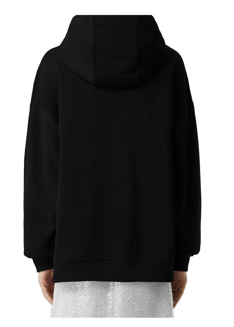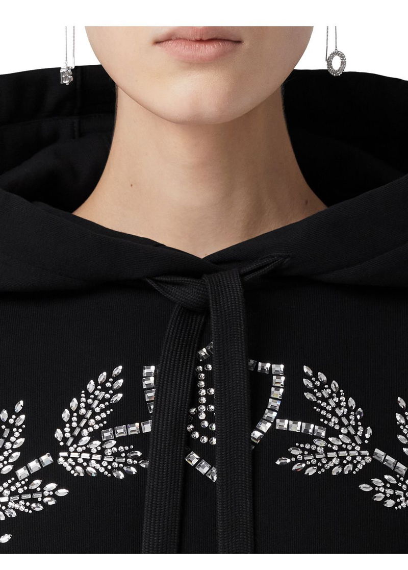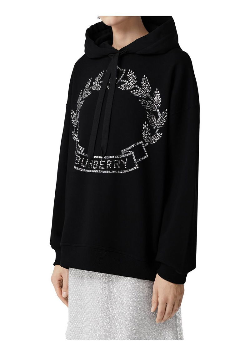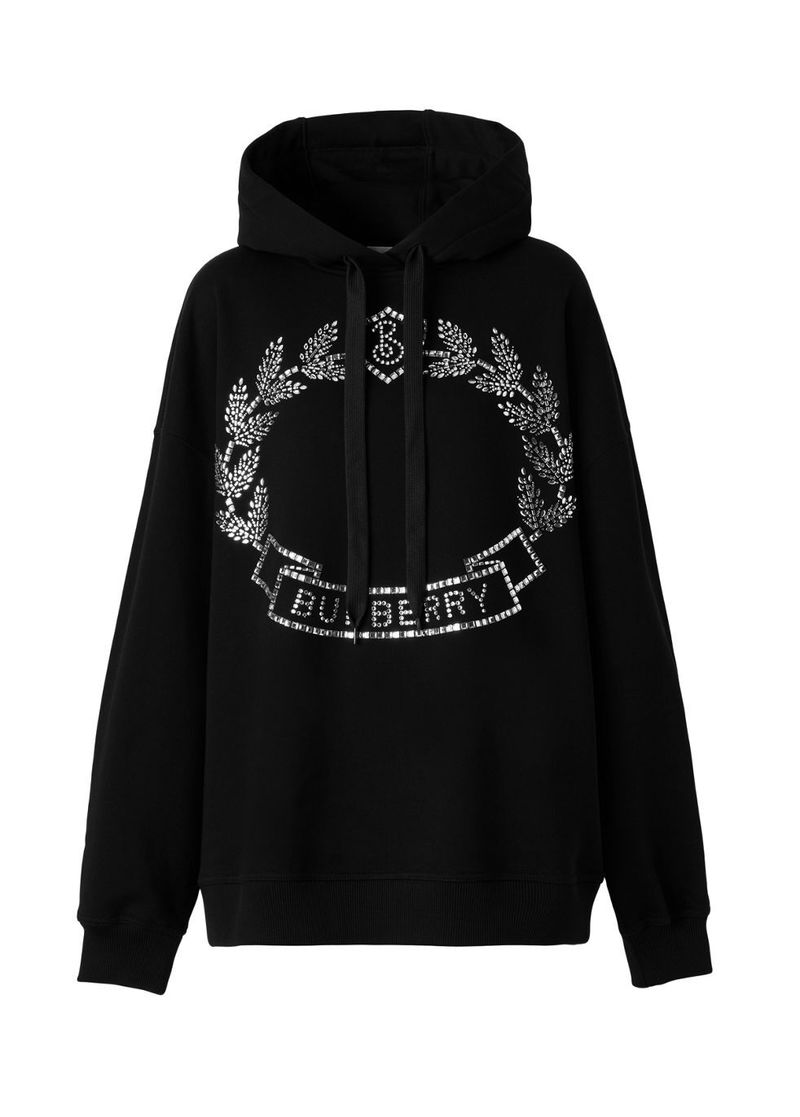 An oversized hoodie containing organic loop-back cotton, highlighted with a crystal-embellished oak leaf crest and logo - a reconstructed version of the archive emblem. The design is part of Riccardo Tiscis Autumn/Winter 2022 womenswear collection.