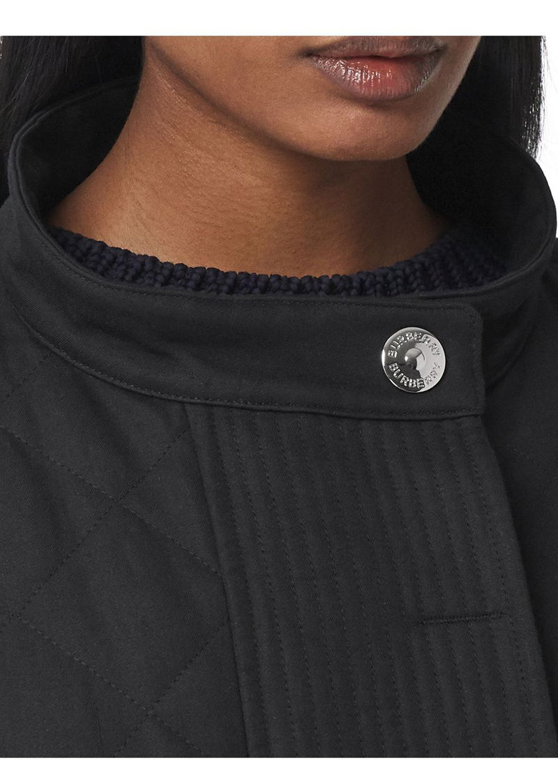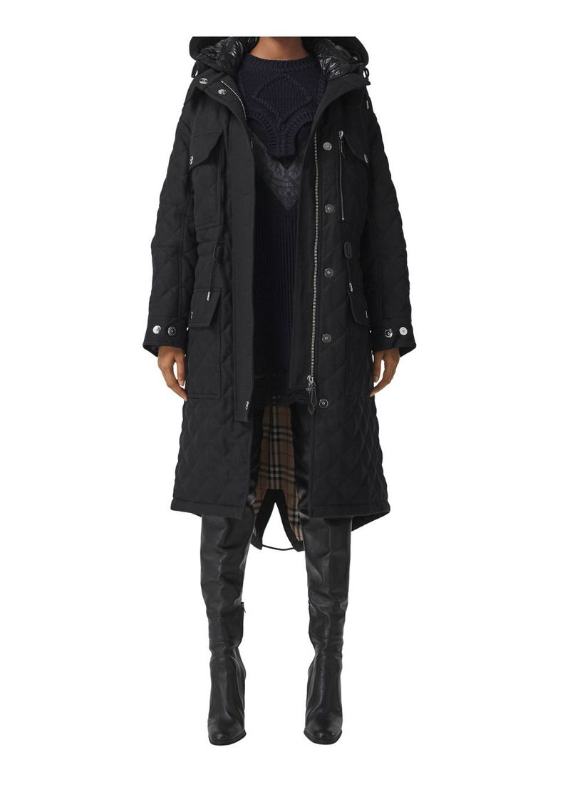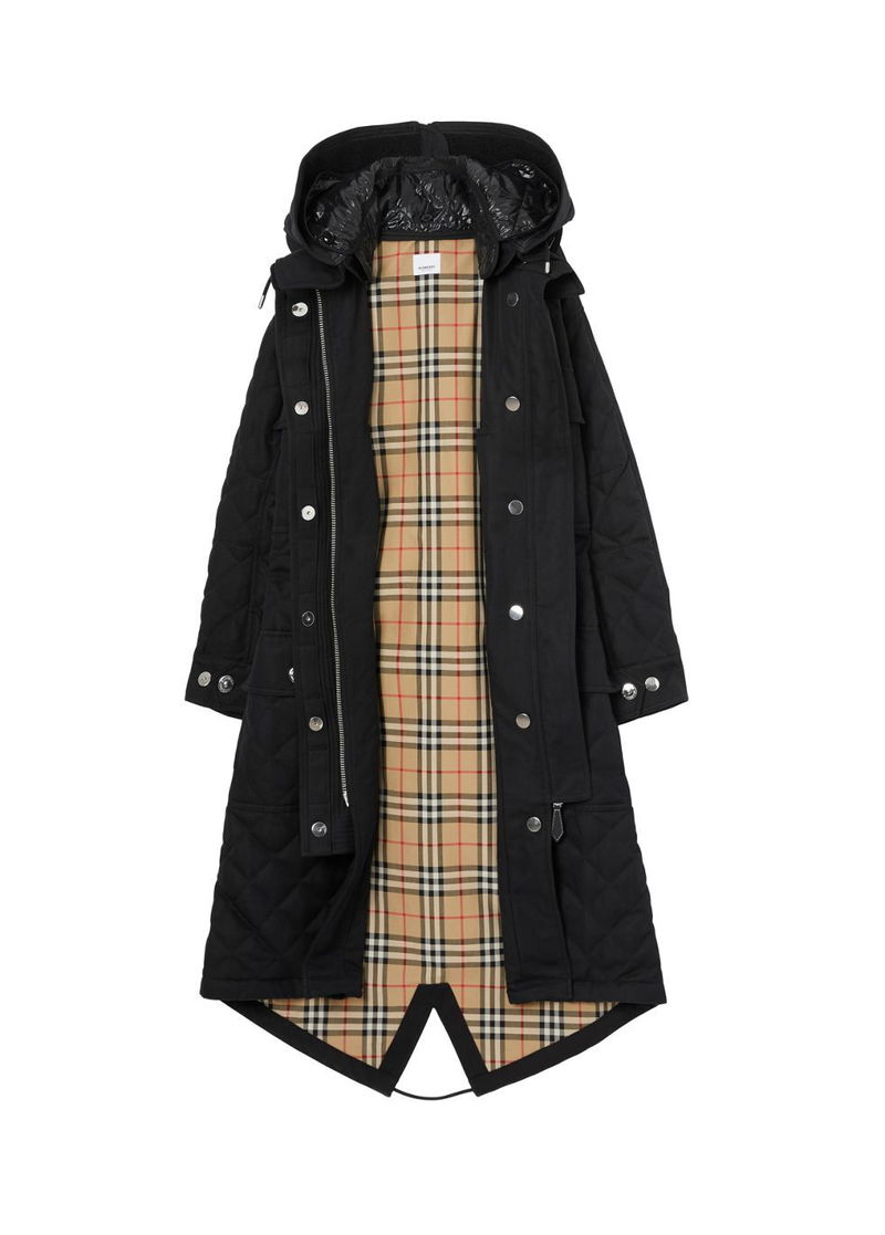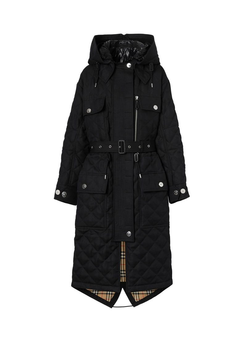 A diamond-quilted parka in ramie cotton, remastered with a trench-inspired back panel in cotton gabardine. Burberry's Vintage check partially lines the design.