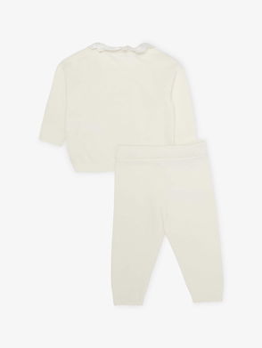 A crew-neck cardigan and trousers in a wool cashmere blend jacquard-knitted with a duck pattern.