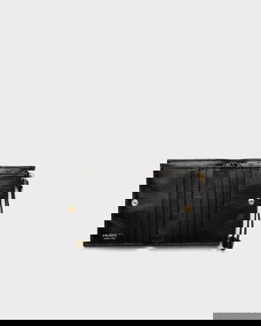 Zip closure with bell charm. Four card slots. Three slip pockets. Hand-painted edges. Polished metal hardware. Embossed Equestrian Knight Design at front.