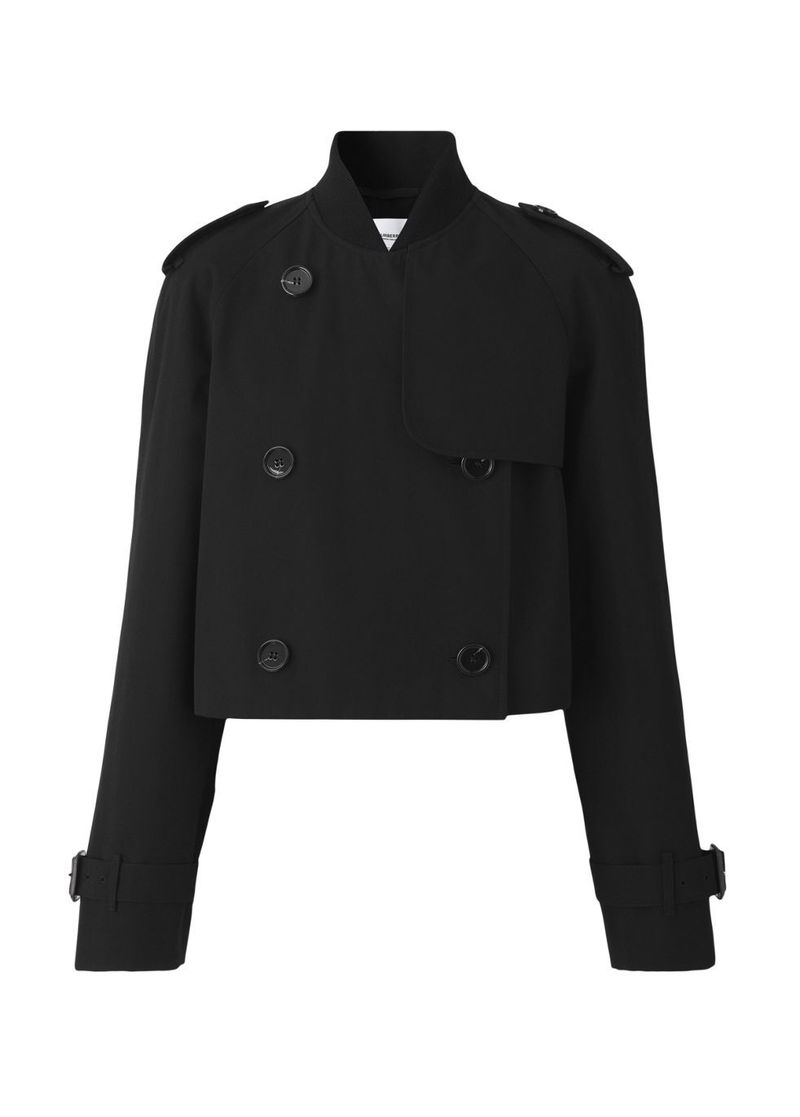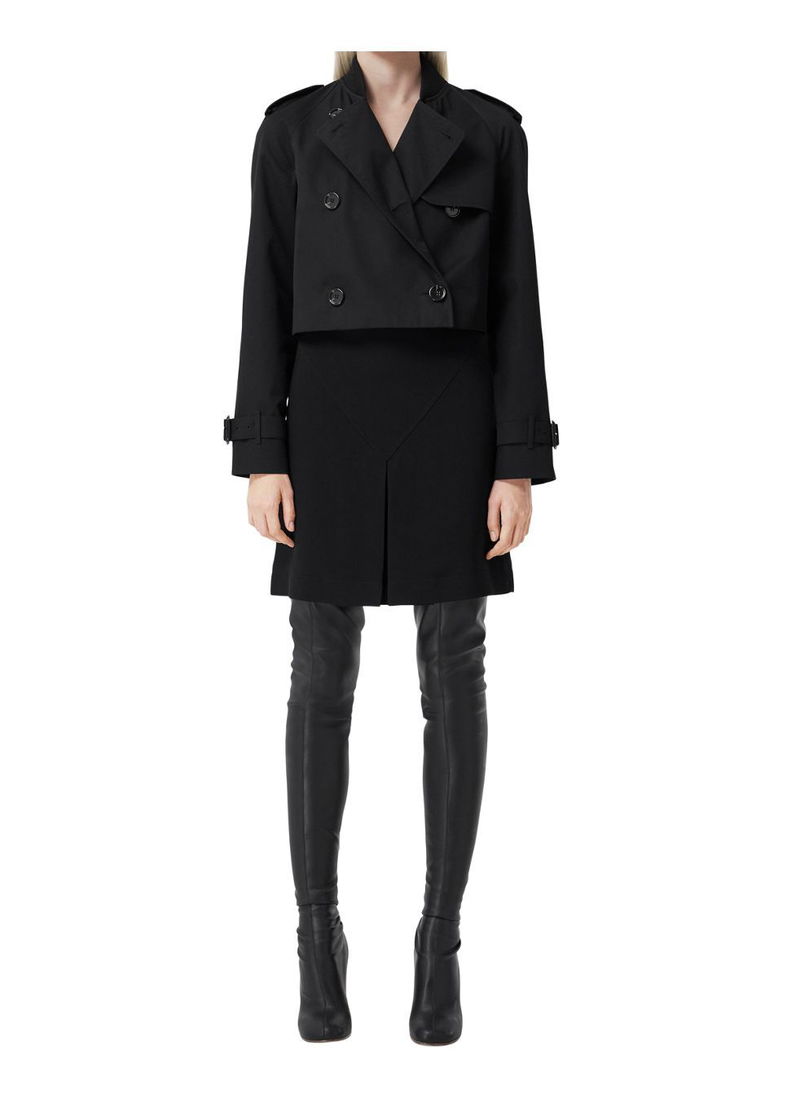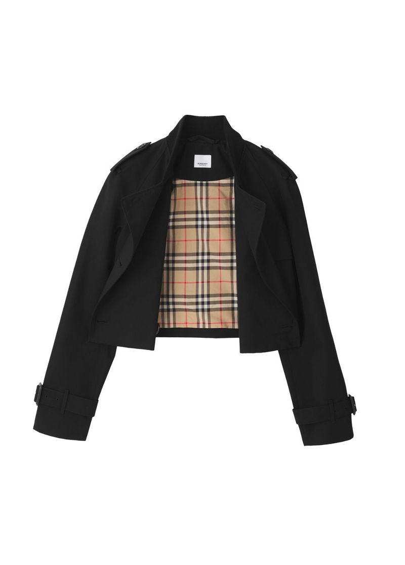 A cropped trench coat in bespoke cotton gabardine, developed for its crease-resistant structure and woven at the Burberry Mill in Yorkshire. The design is styled with a rib-knit collar and is lined in our signature check.