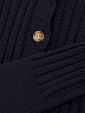 Burberry wool cardigan. Exposed button fastening at front. Regular fit, V-neck, long sleeves, all-over check print, ribbed trims, straight hem. Midweight, slight stretch.