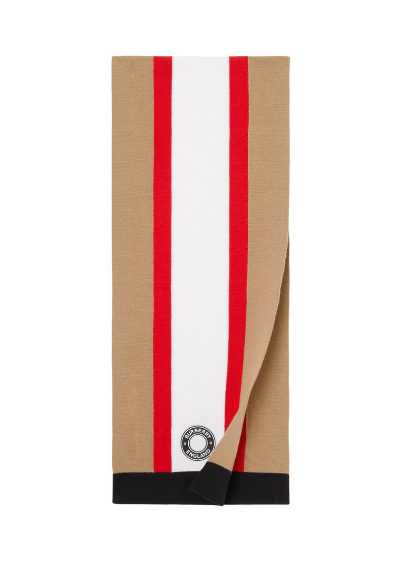 A cosy scarf in a wool blend, intarsia knitted with an interpretation of our Icon stripe. The design is tagged with our logo appliqué.