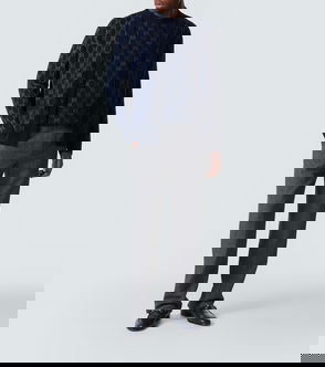 A funnel-neck silhouette cut to a relaxed fit in a wool-cashmere blend. The design is highlighted with colour-block sleeves and a tactile logo graphic appliqué.