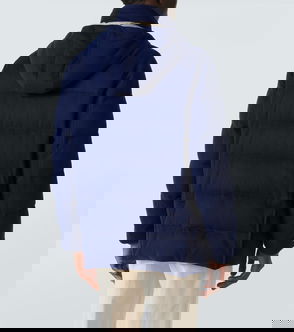 Burberry’s black coat is made from quilted-down shell with a panelled logo along the sleeves, evidencing the British house’s streetwear influences.