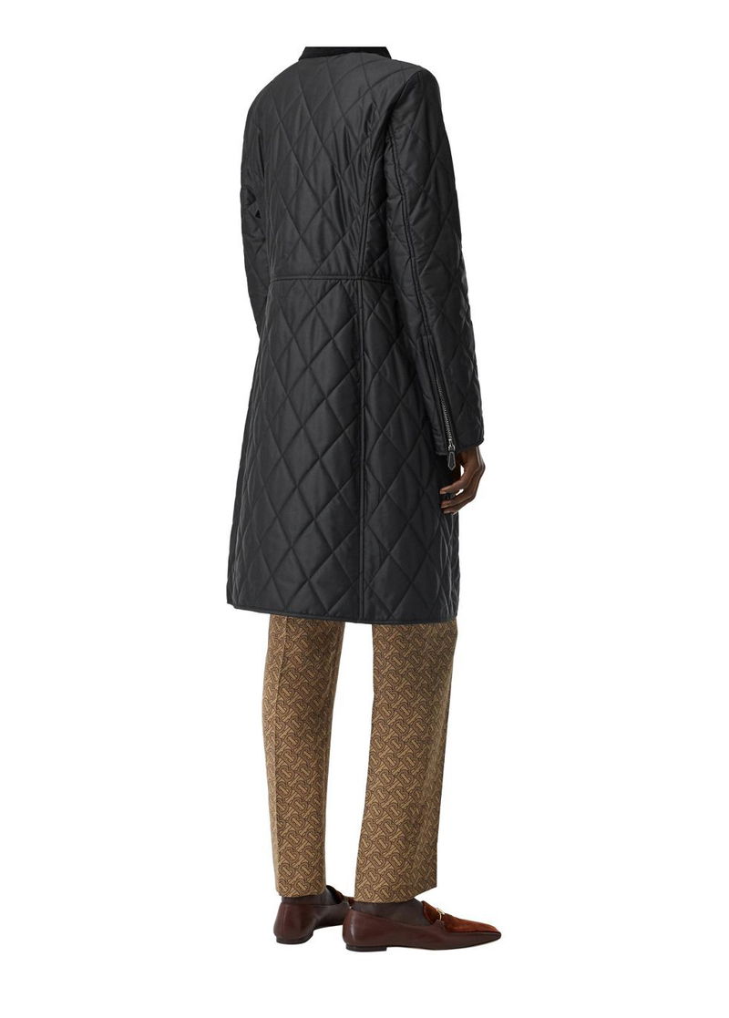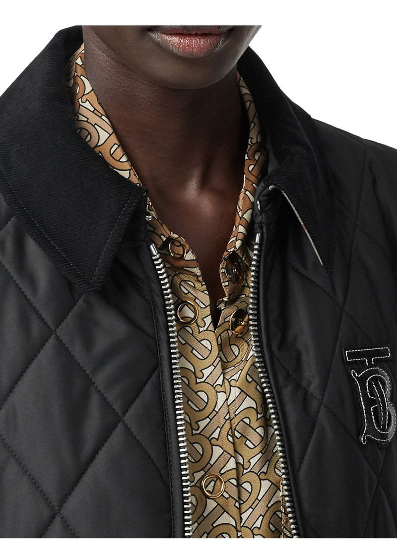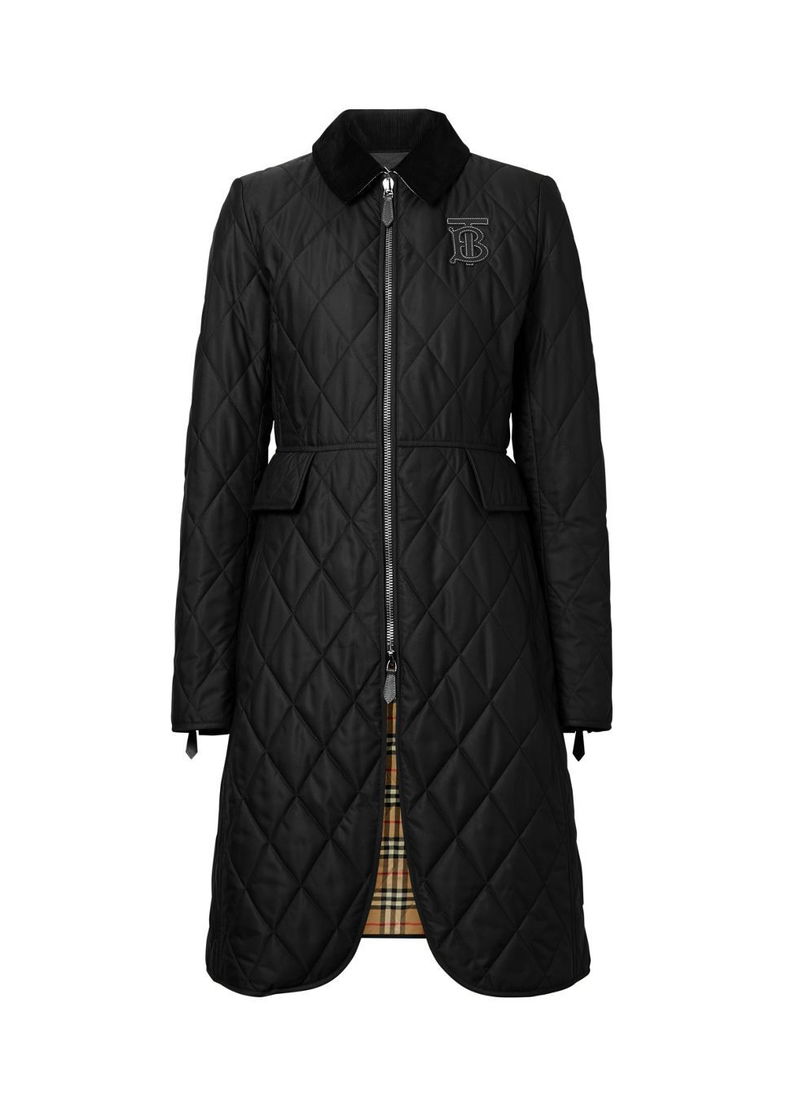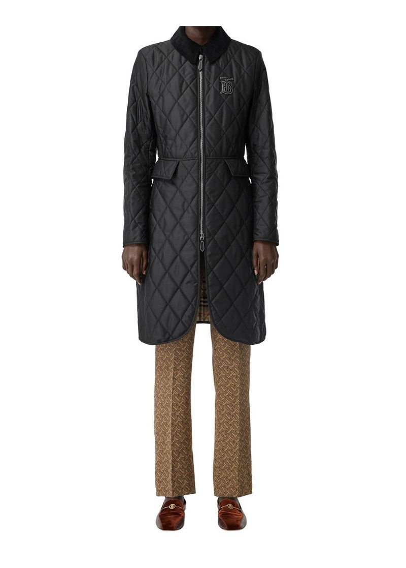 A diamond-quilted riding coat with a cinched silhouette, featuring a corduroy collar and an appliquéd leather Monogram motif.