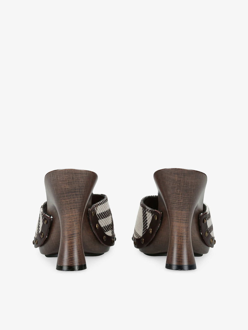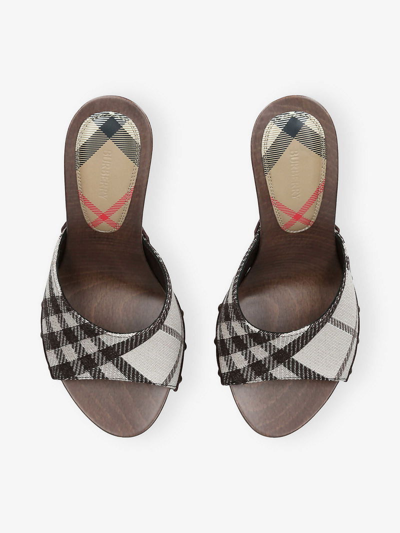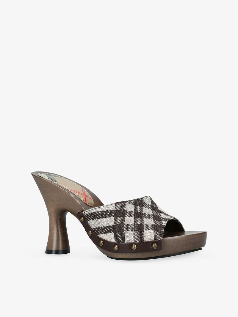 Burberry wooden mules. Almond toe, Equestrian Knight design at sole, check pattern.