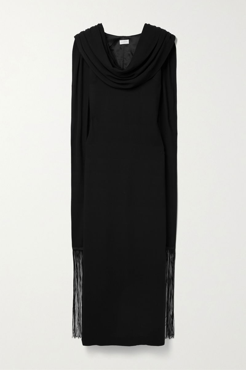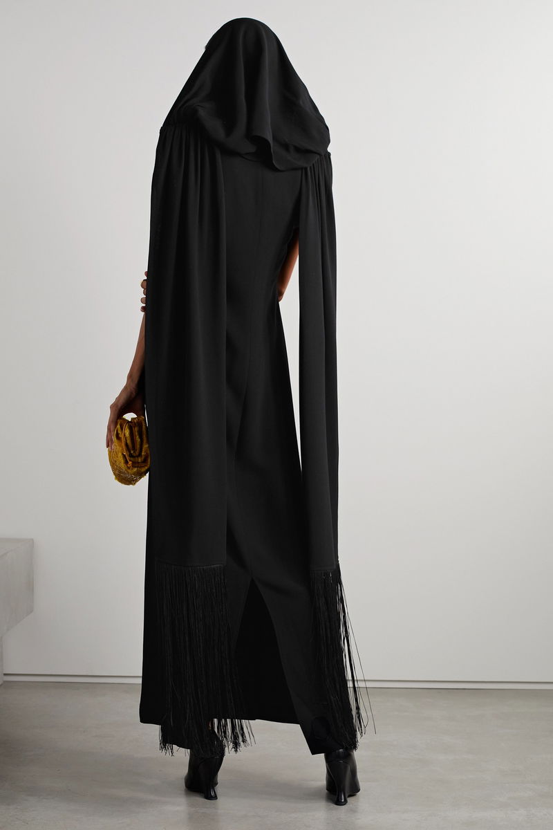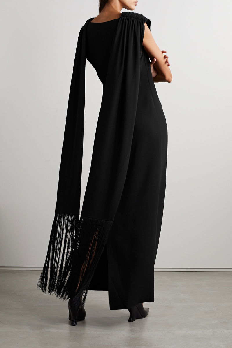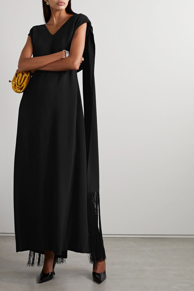 By Malene Birger's 'Cressida' maxi dress is designed with fringed panels that can be left to drape at the front or back, or even styled as a hood. It's made from crepe for a loose fit and has padded shoulders. Style yours with a statement bag.