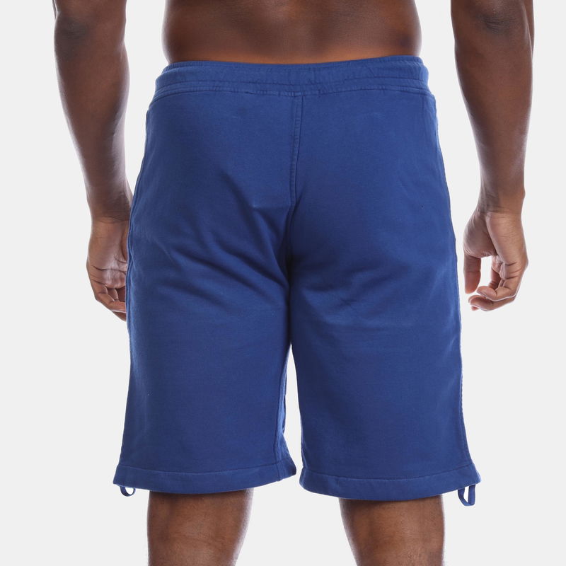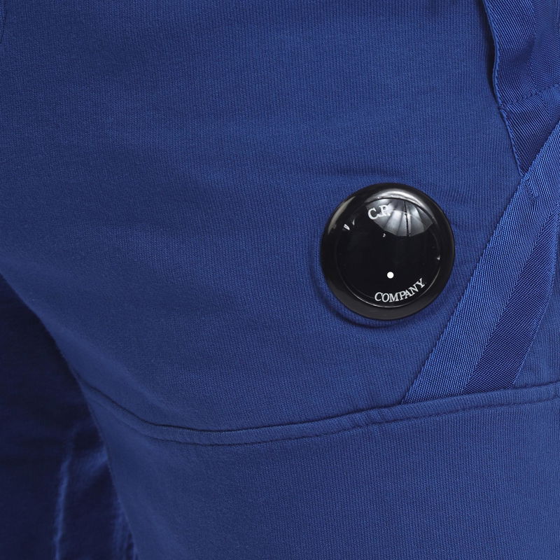 Mens C.P. Company Lens Fleece Shorts in blue. Elasticated waistband with drawstring. Zip pockets. Premium fleece construction. Brand's signature lens detail on the leg. Relaxed fit.