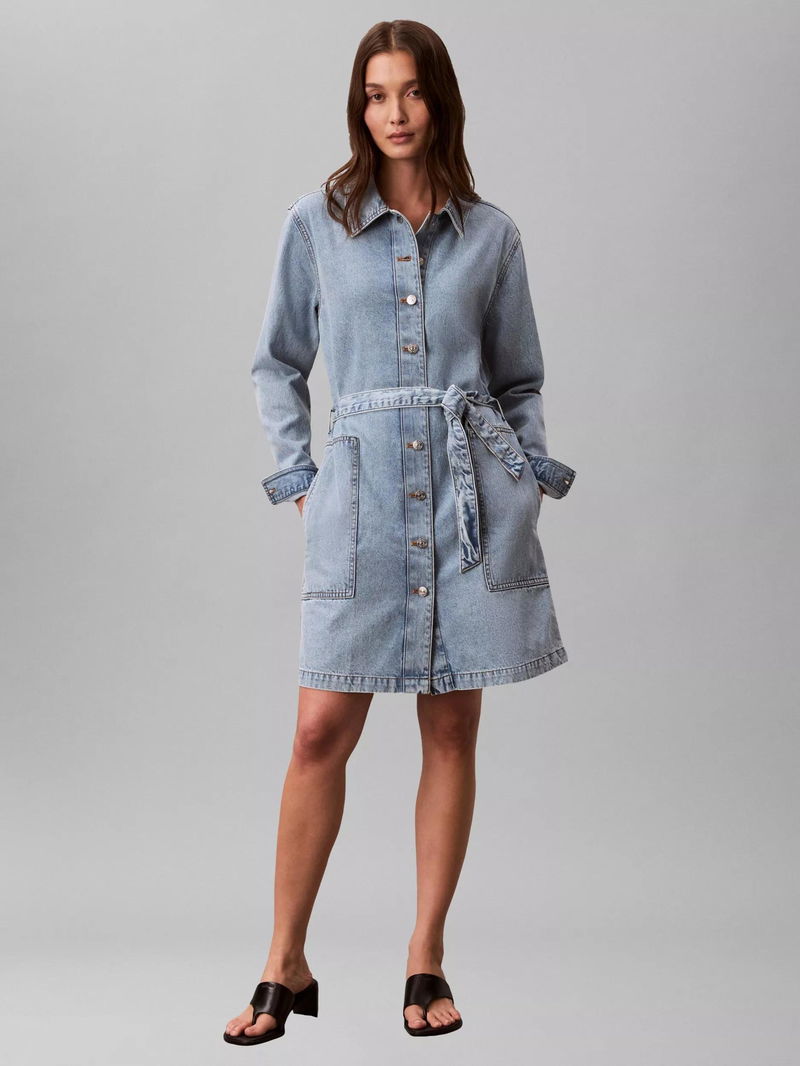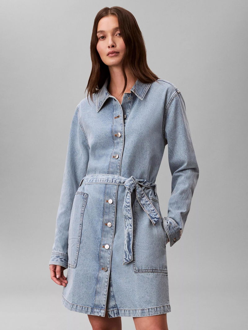 Belted Denim Shirt Mini Dress, Coastal Light
