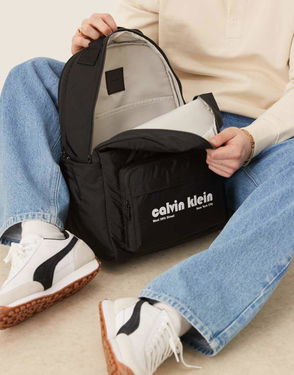 Top handle Adjustable straps Logo detail Zip-top fastening External pocket Laptop sleeve.