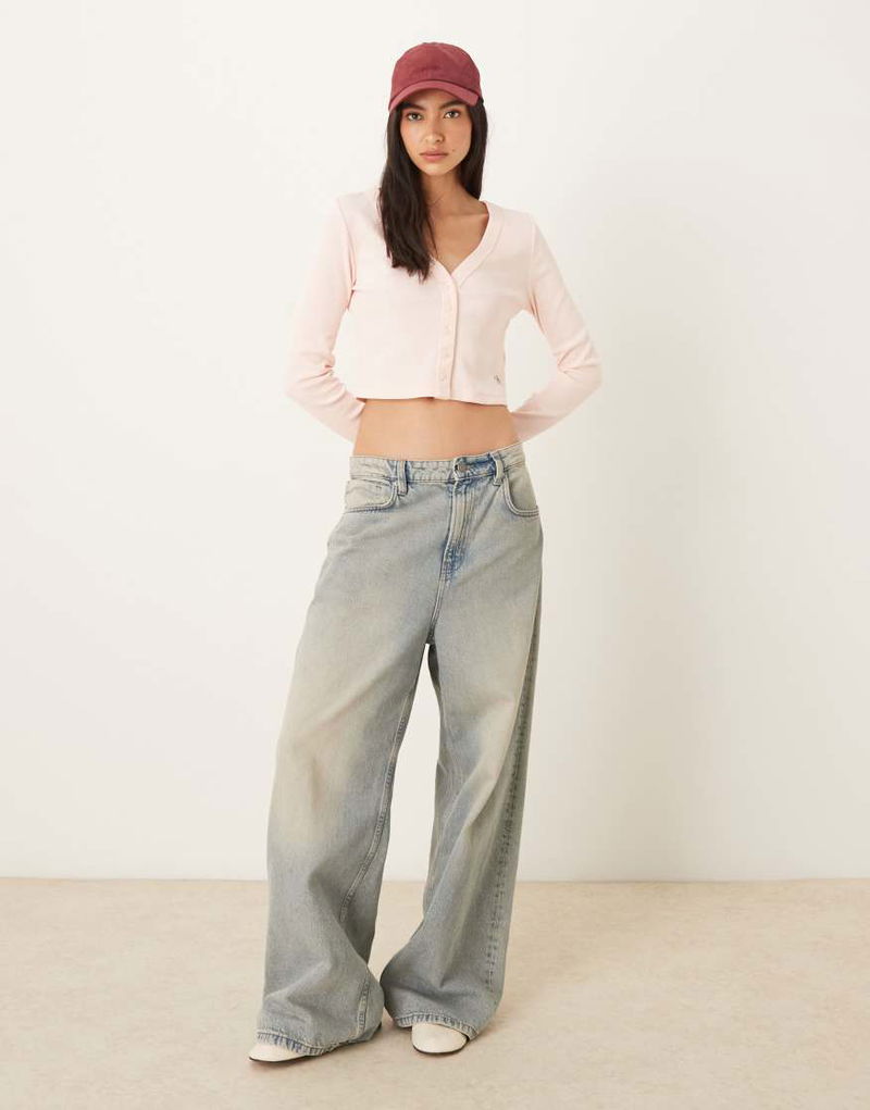 Jeans Long Sleeve Button Up Crop Cardigan Top In Pink