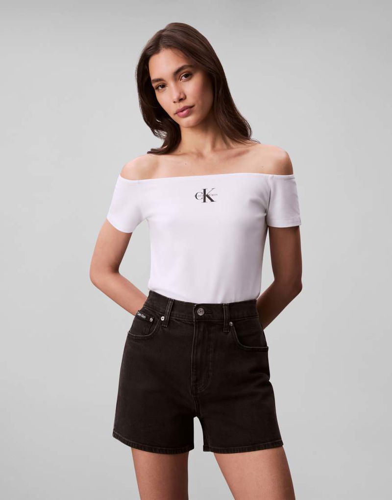 Jeans Short Sleeve Off Shoulder Logo T-shirt In White