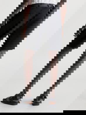 Regular rise Belt loops Concealed fly Functional pockets Branded patch to reverse Turn-up hem Slim fit.