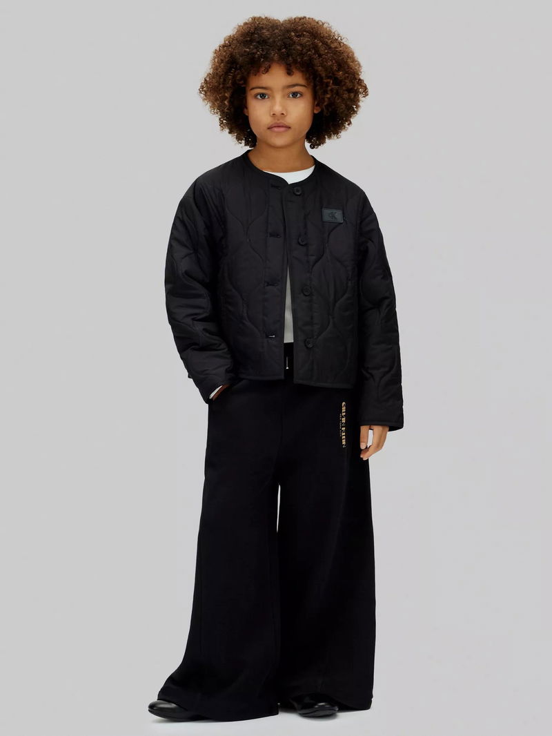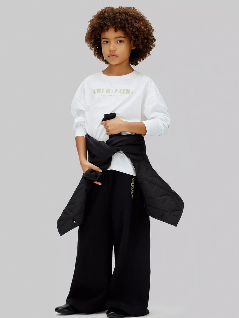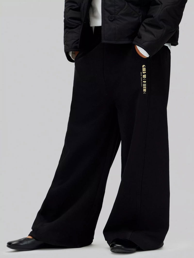 From Calvin Klein comes these wide-leg trousers with glittered branding. They are made from soft cotton terry and have an elasticated drawstring waist to ensure a great fit. Completed with side slit pockets.