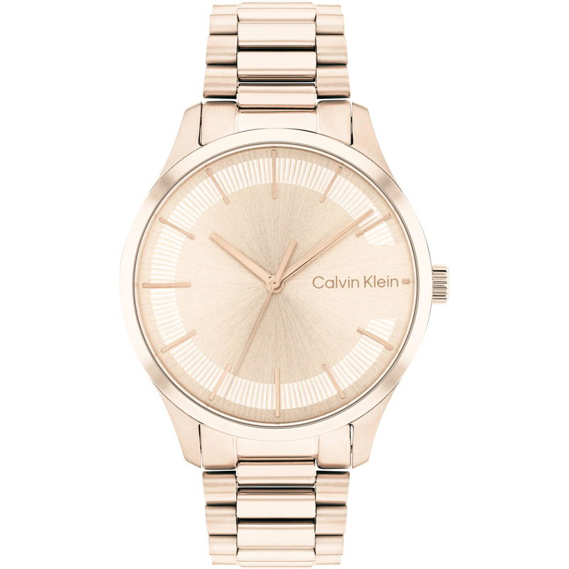Ladies watch from Calvin Klein. Featuring a 35mm stainless steel carnation gold IP case, carnation gold sunray dial, finished on a carnation gold bracelet.