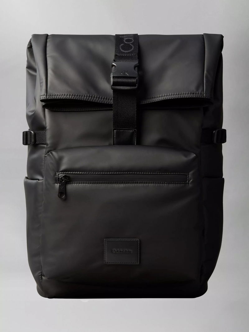 This thoughtfully detailed Puffer Utility Roll Top Backpack is a versatile accessory for contemporary life. It features a roll top with a speed clip closure, and includes both a top handle and adjustable shoulder straps. Functional elements include side adjustable straps, side pockets, a sealed front zip pocket, and a small zip pouch with a carabiner closure. Finished with a Calvin Klein logo patch.