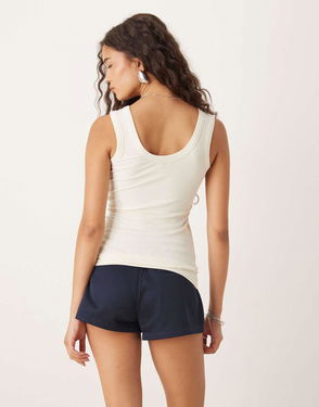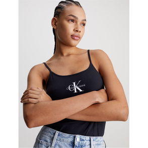 Crew neck. Sleeveless style. Logo embroidery. Cropped length. Slim fit.