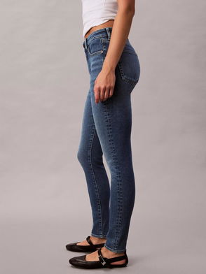 Slim-leg jeans, Denim, Zip-detailed, Side seam stripes, High-rise cut, Concealed hook and zip fastening at front, Non-stretchy fabric, Mid-weight fabric.