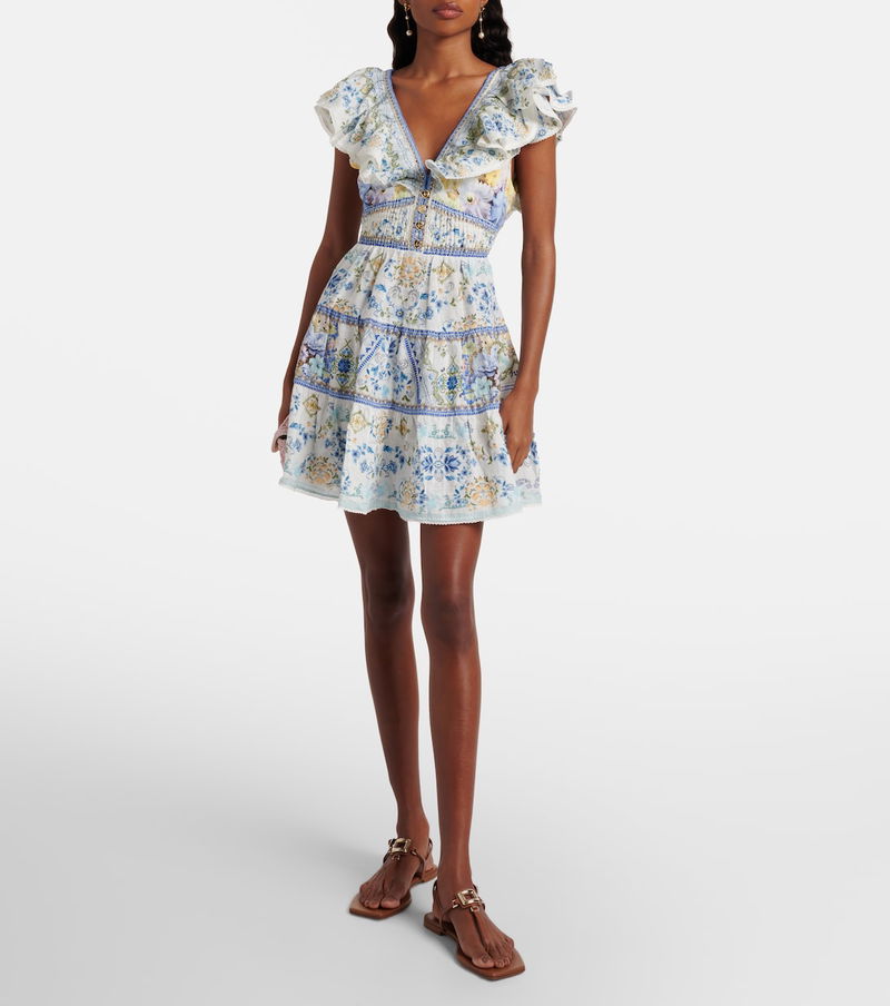 Maximalists adore Camilla's hand-drawn prints and precisely placed embellishments. Made from linen, this crystal-embellished minidress flaunts a flowing silhouette with a colorful floral motif, tiered sleeves, and a self-tie back.