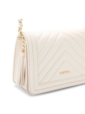 The Carvela Chai Flapover bag features a grey exterior. The front flap features gold branded panel coordinating with the chain cross body strap.