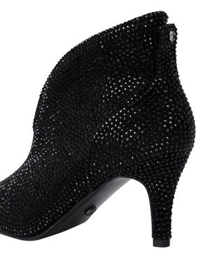 The Flute Boot has a black microsuede upper with all over black crystal embellishment. There is a small tab at the back of the ankle with micro Icon C stud. Heel height: 70mm.