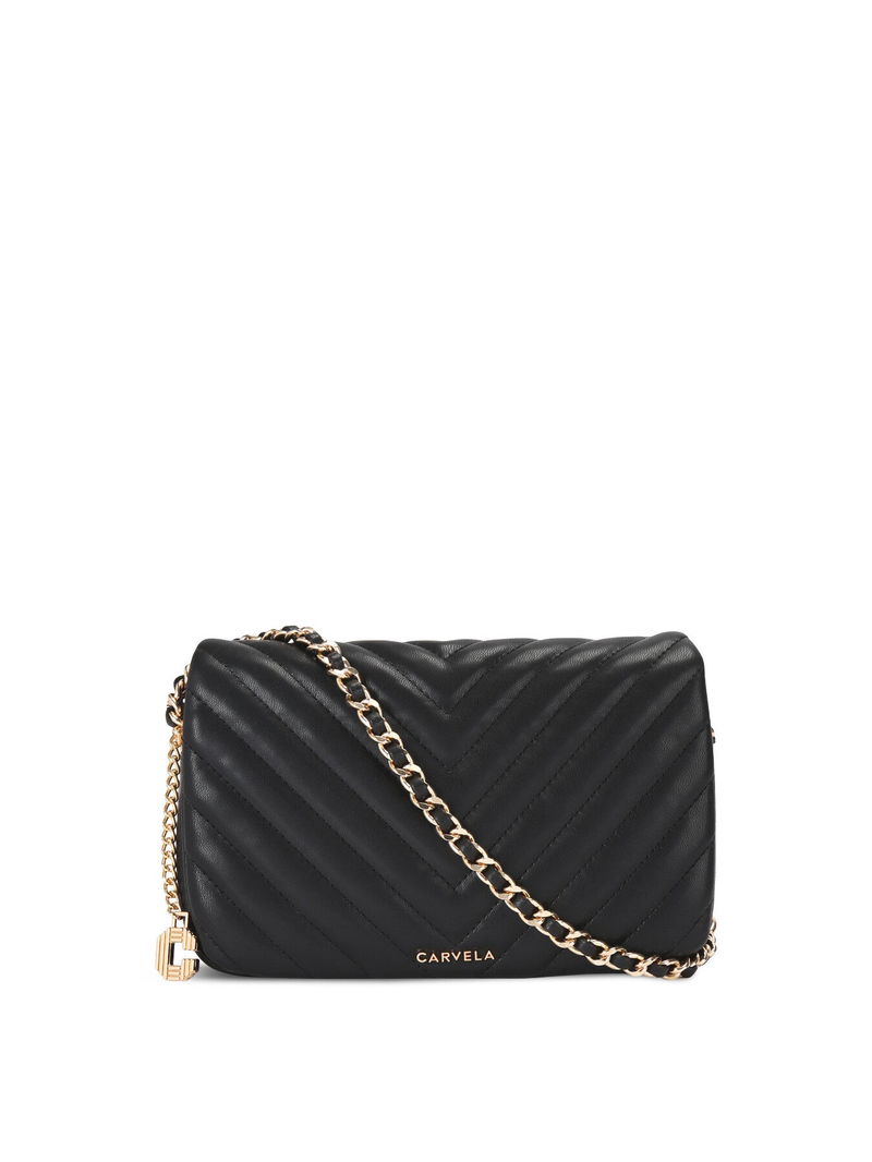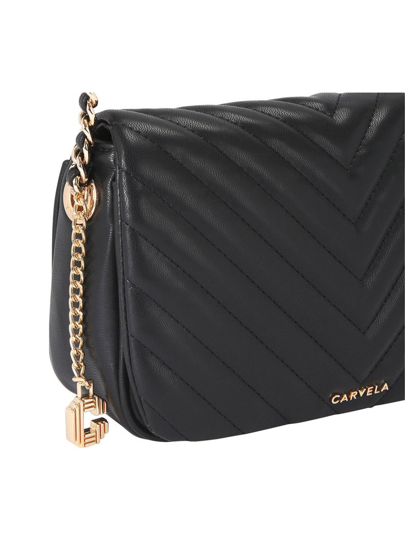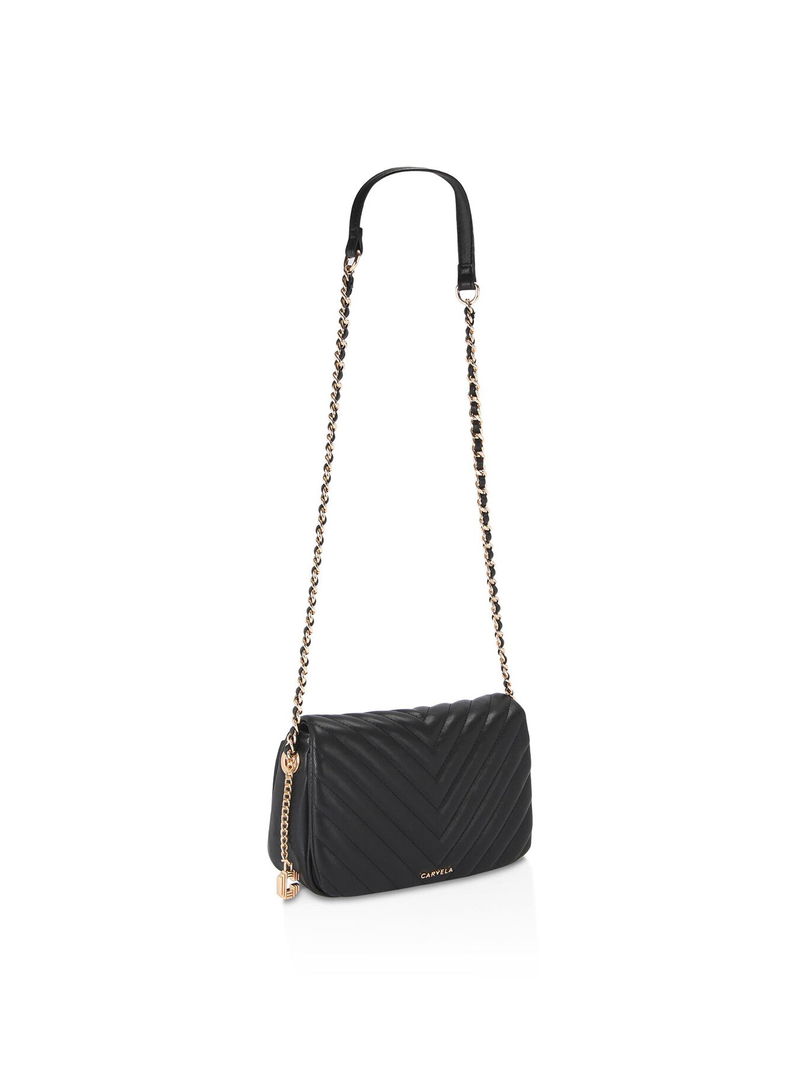 Product Details This Carvela Lola Shoulder Bag features a black exterior with overstitch chevron pattern. The front flap features gold tone branding with an Icon C charm on the side. Dimensions: 14cm (H), 23cm (W), 7cm (D). Strap drop cross body: 111cm.