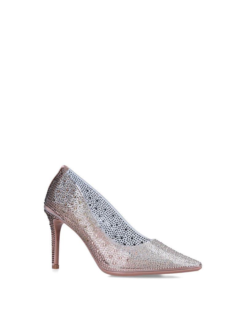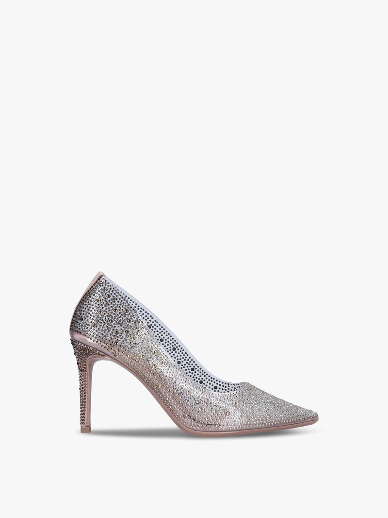 Arriving in blush, the Lovebird Vinyl sits on a stiletto heel. The clear vinyl is embellished with blush ombre crystals.