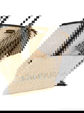 Product Details The Carvela Mini Mandy bag features a neutral woven raffia exterior. The top handles and strap closure are both accented with gold tone hardware. There is a black luggage tag on the top handles. 14cm (H), 17cm (W), 9cm (D). Strap length: 121cm.