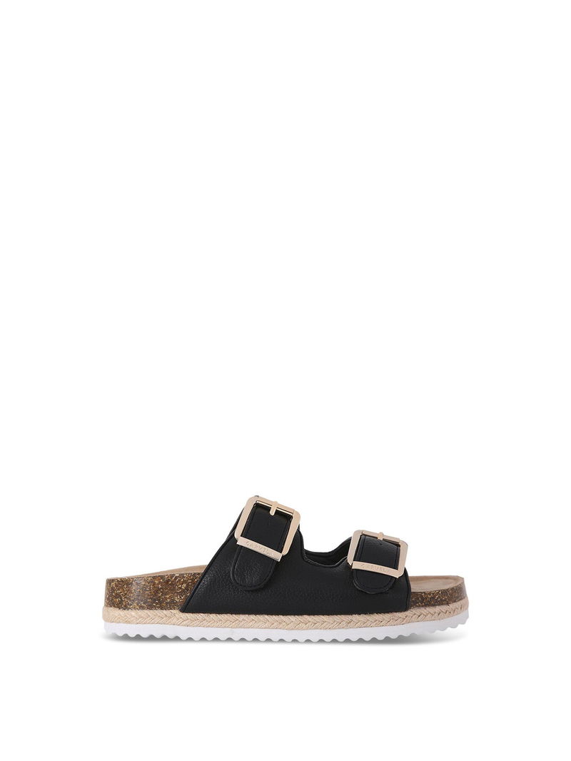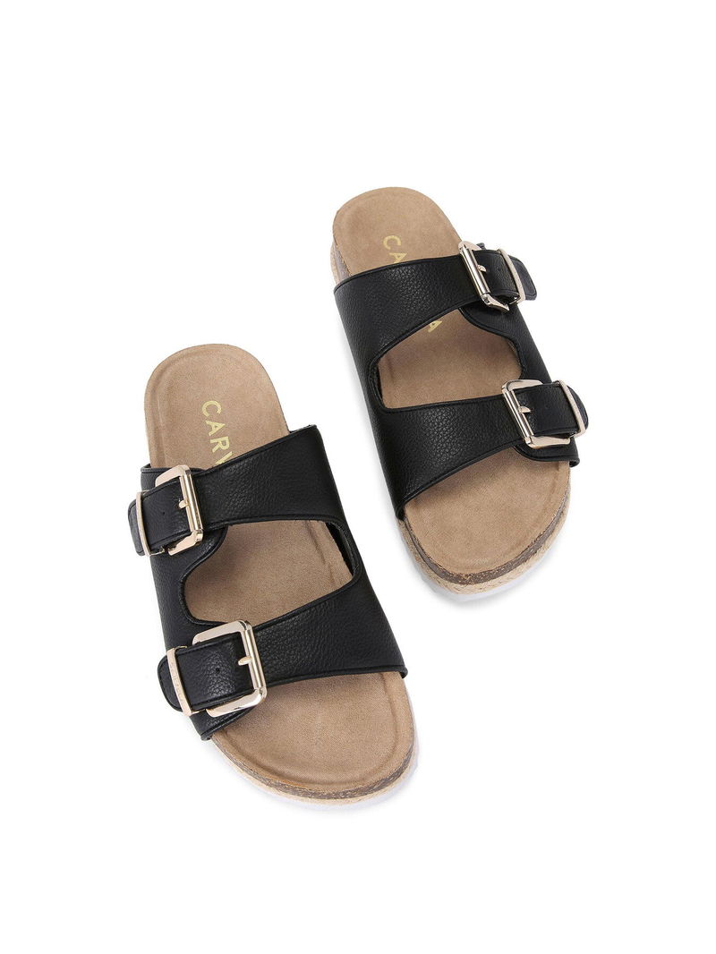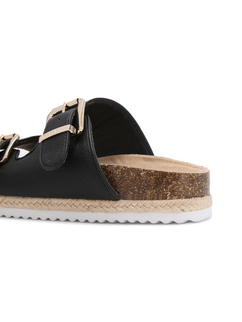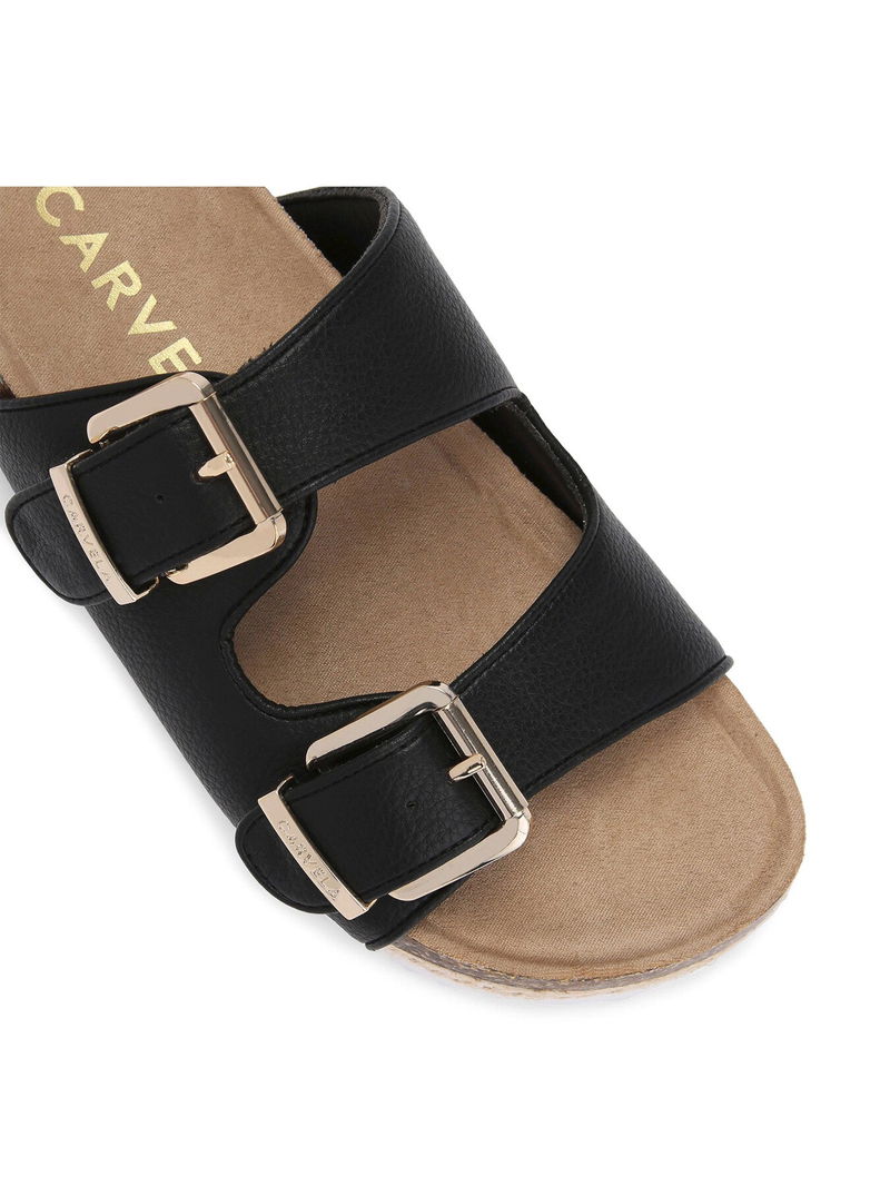 The Carvela Paradise is a slip-on sandal with black upper. There are two straps across the foot that are fastened with two gold buckles. The moulded footbed and sole features a rope effect with rubber outsole.