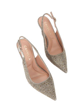 This Carvela Regal Bow slingback heel features a rose gold upper topped with crystals and traditional ankle strap fastened with silver buckle. The pointed toe is topped with a silver crystal embellished bow.