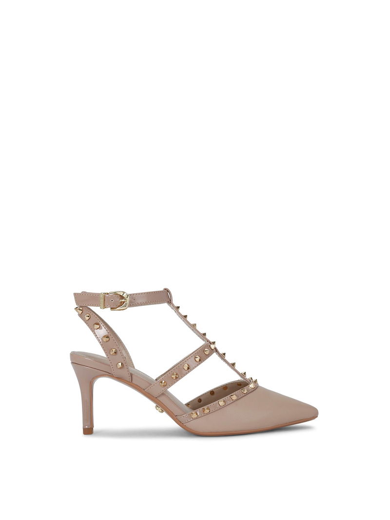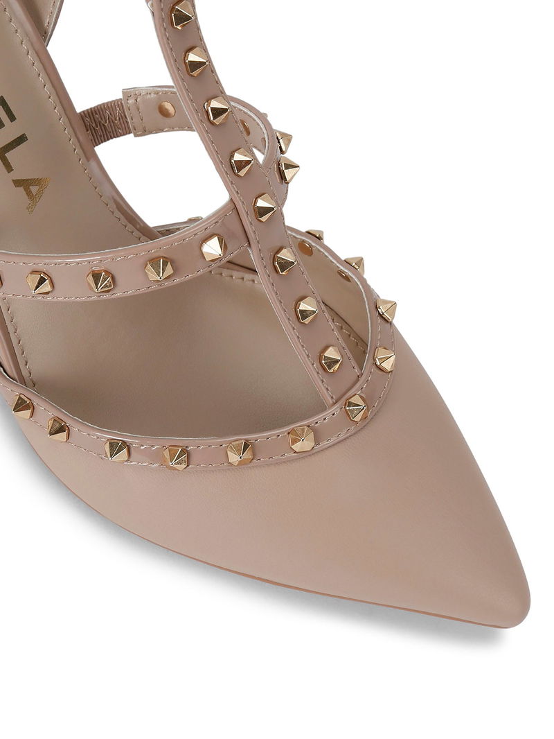 The Samba Court heel is crafted in soft taupe, elevated with statement gold-tone studs across the straps. A pointed, enclosed toe and sleek stiletto heel create a confident, modern silhouette.