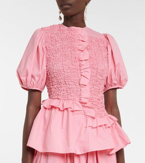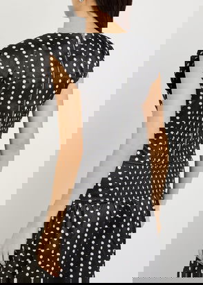 The voluminous shape of Cecilie Bahnsen’s black Babett top has become synonymous with the designer’s quaint-yet-modernist sensibility. It’s cut from cloqué that’s playfully woven with white daisies and falls from rolled shoulder straps into a square neckline and gathered empire line that flutes to an undulating flared silhouette.