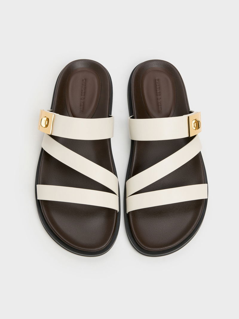 These Aelin strappy sandals in white feature a triple-strap design, polished gold-tone turn-lock buckles, open round toes and cushioned flat soles. Let them complement your casual off-duty looks with their clean lines and polished aesthetic.