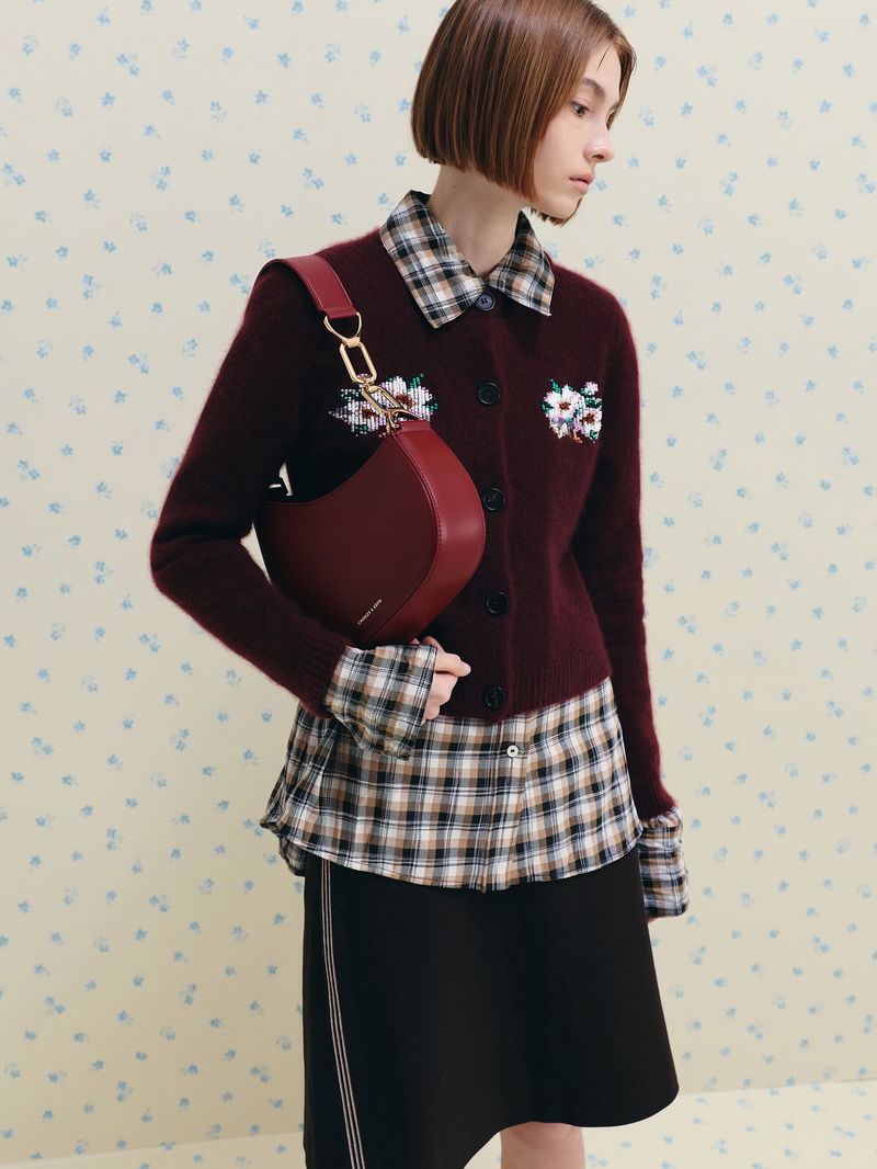 This Agatha shoulder bag in burgundy is made with faux leather and features an asymmetrical design, a polished chain accent, and a zip closure. Carry it to add a striking element to your polished professional outfits.