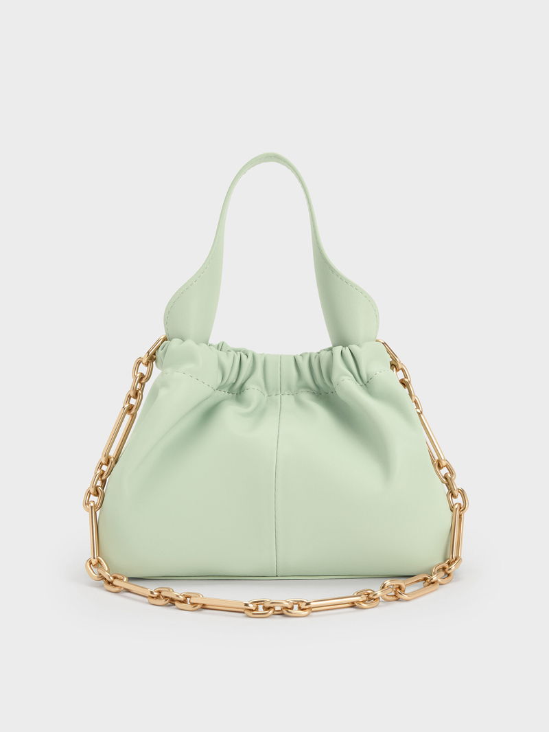 This Ally slouchy chain-handle bag in mint green features a ruched design, a magnetic closure, and not one but two detachable straps. Use it to bring soft tactility and a fresh pop of colour to your everyday wardrobe.