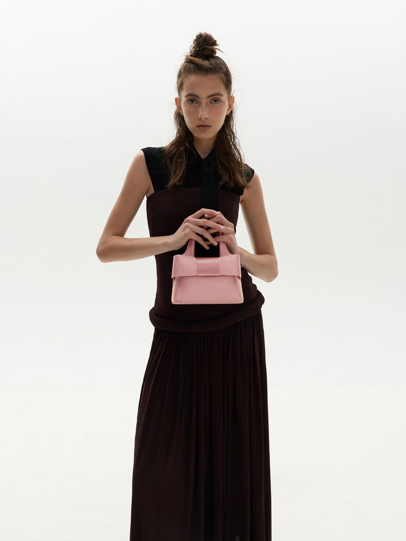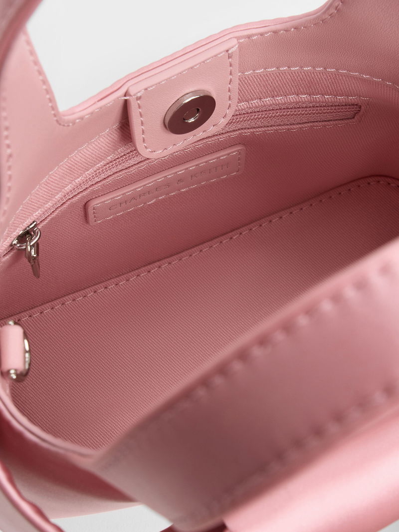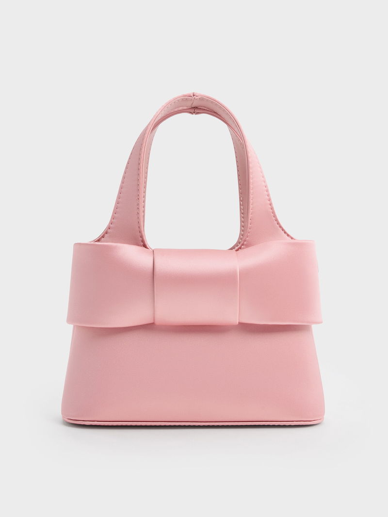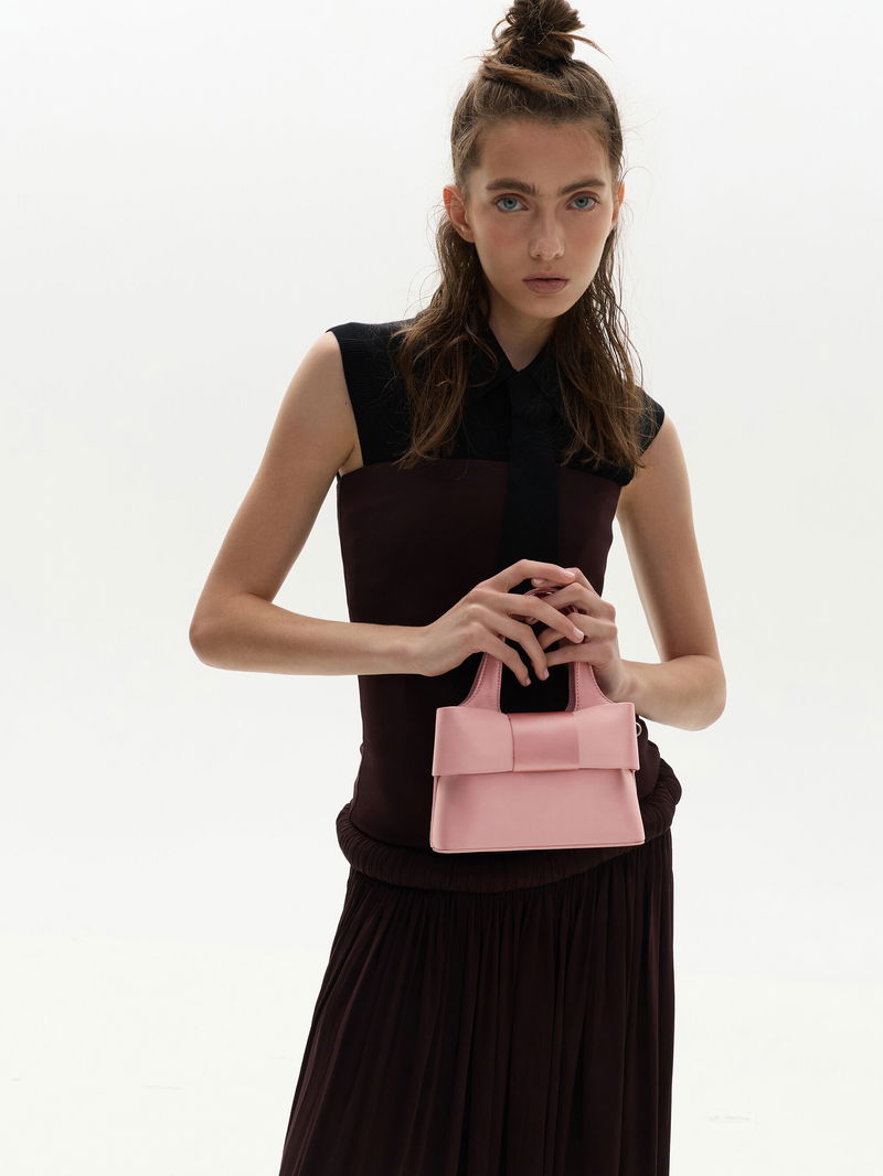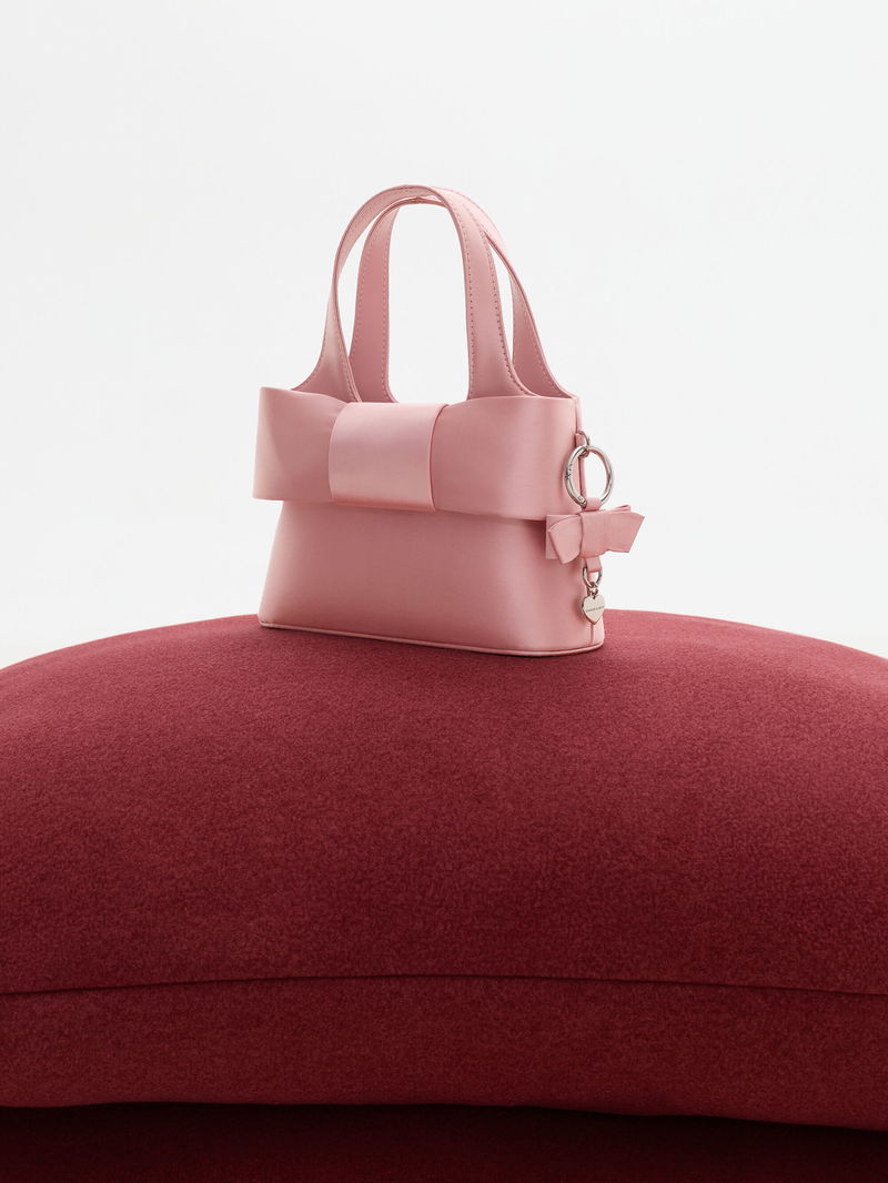 This Aravis bucket bag in pink is made with satin and features an oversized bow, double handles, and a boxy silhouette with a magnetic closure. Let it complement bold special-occasion outfits with its outstanding design.