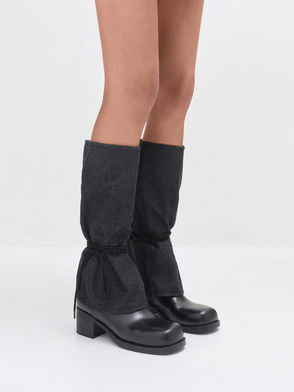 These knee-high boots in dark brown have a burnished finish and feature double buckled straps, lace-up fronts, rounded toes and thick soles. Wear them with long coats or full skirts to balance feminine silhouettes with rugged utilitarian details.