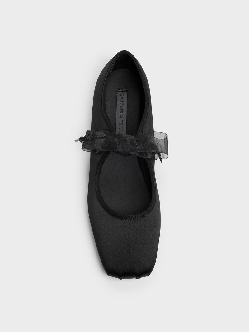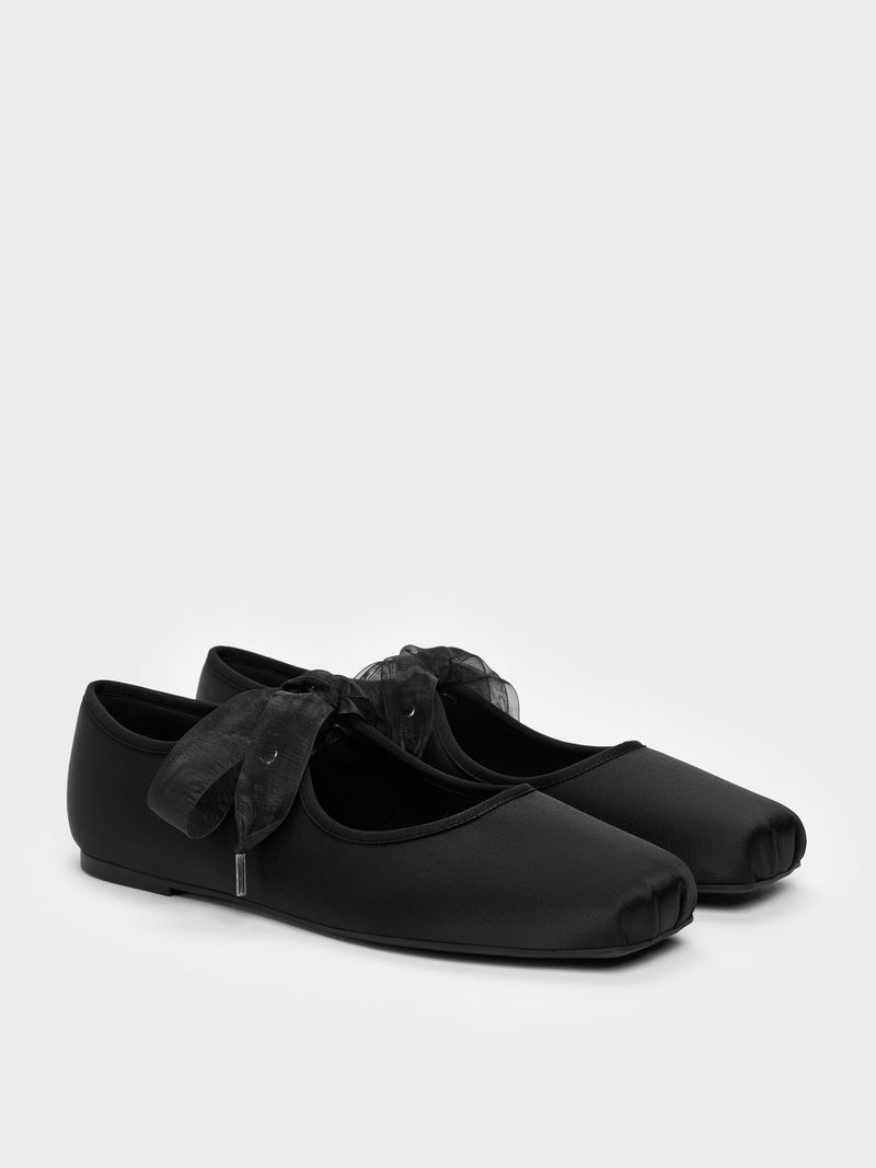 These Camila Mary Jane flats in black are made with satin and feature sheer laces, modern square toes and comfortable flat soles.
