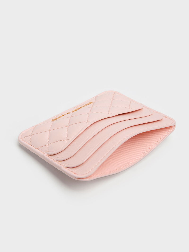 This Cleo card holder in soft pink features a quilted finish, a slim, compact design and multiple card slots. It will slip easily into small handbags and snug side pockets.