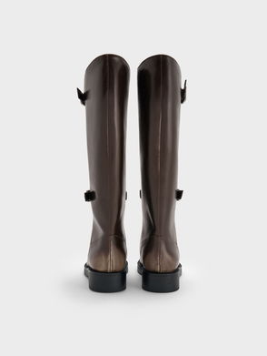 Confidence has never looked this good. Slip on these concrete heeled knee-high boots with a denim skirt for an edgy yet elegant look.