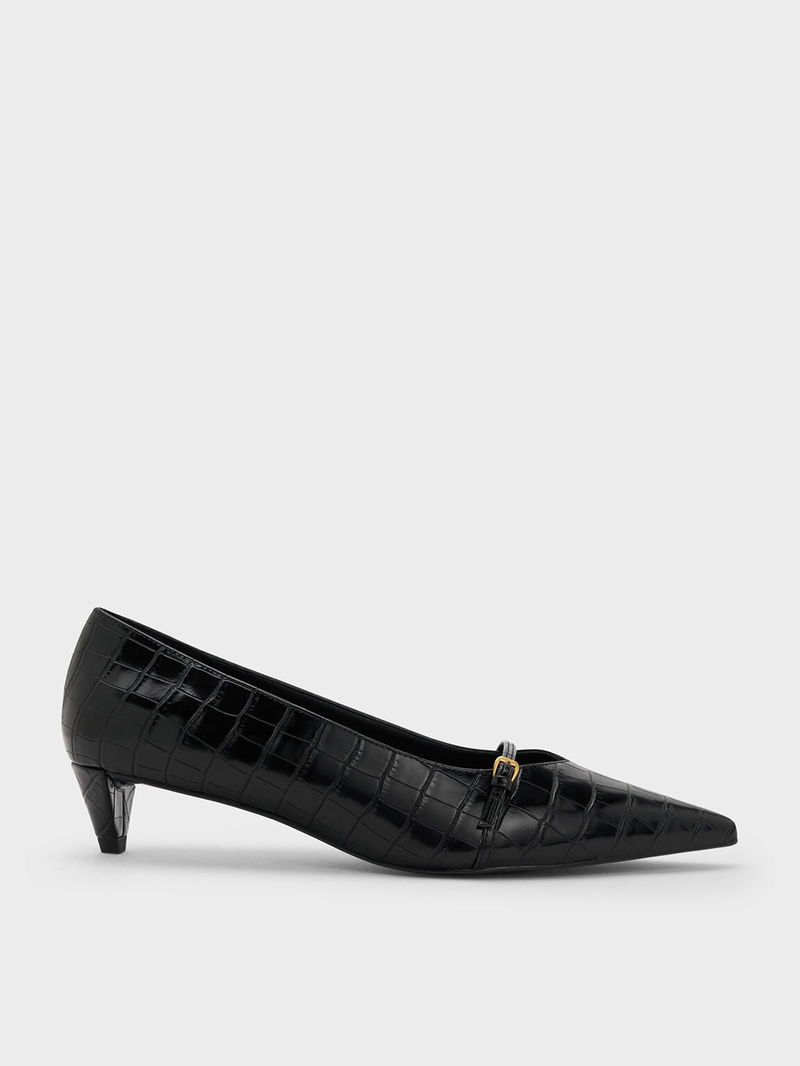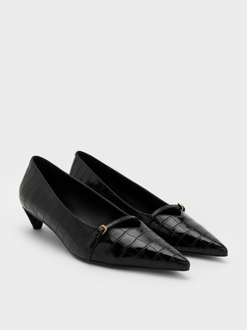 Croc-Effect Buckled Pointed-Toe Kitten-Heel Pumps