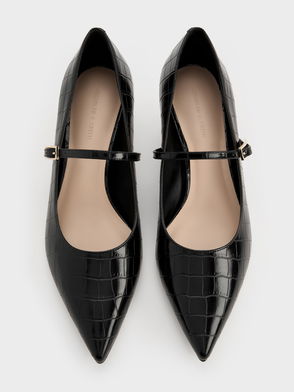A slip-on-and-go style for quick elevation. The croc-stamp design and chunky heel make these chocolate brown pumps perfect for many occasions. Try them with wrap dresses and denim jeans.