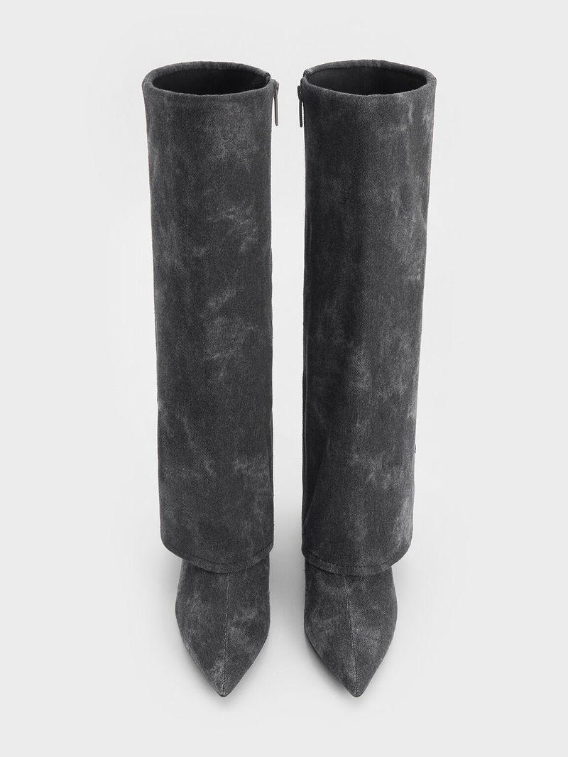 Denim Fold-Over Pointed-Toe Knee-High Boots