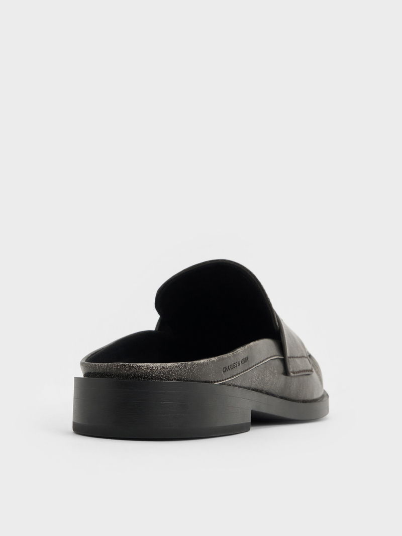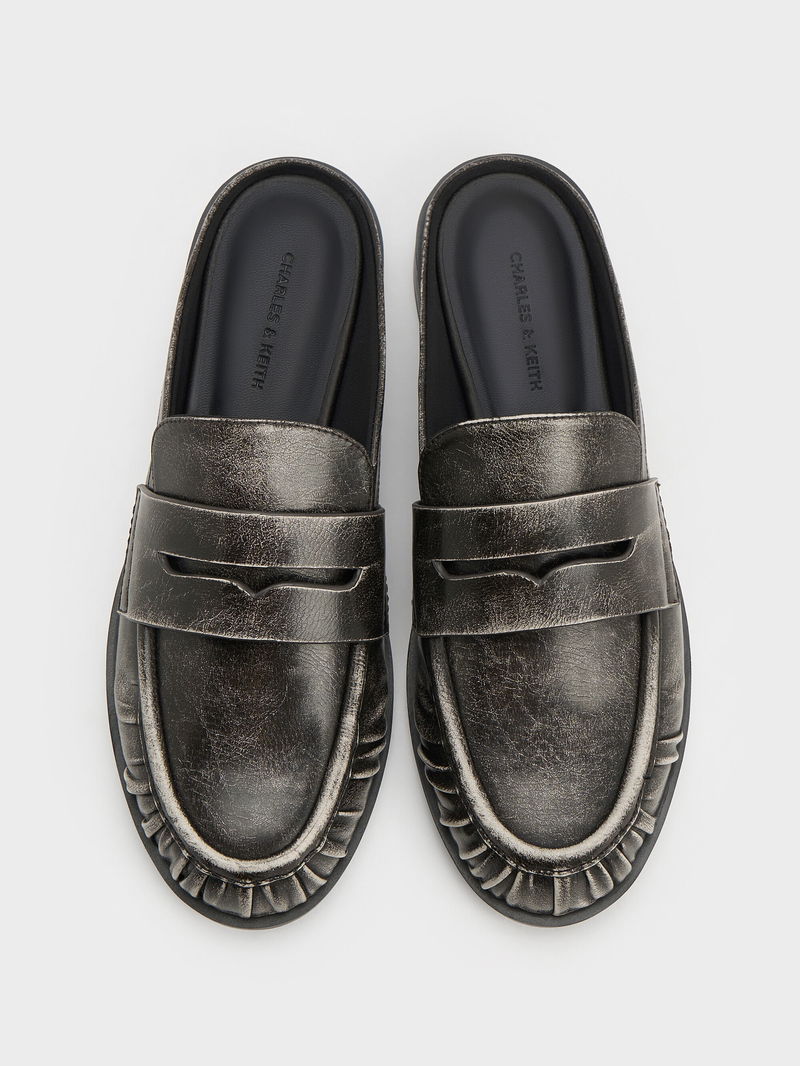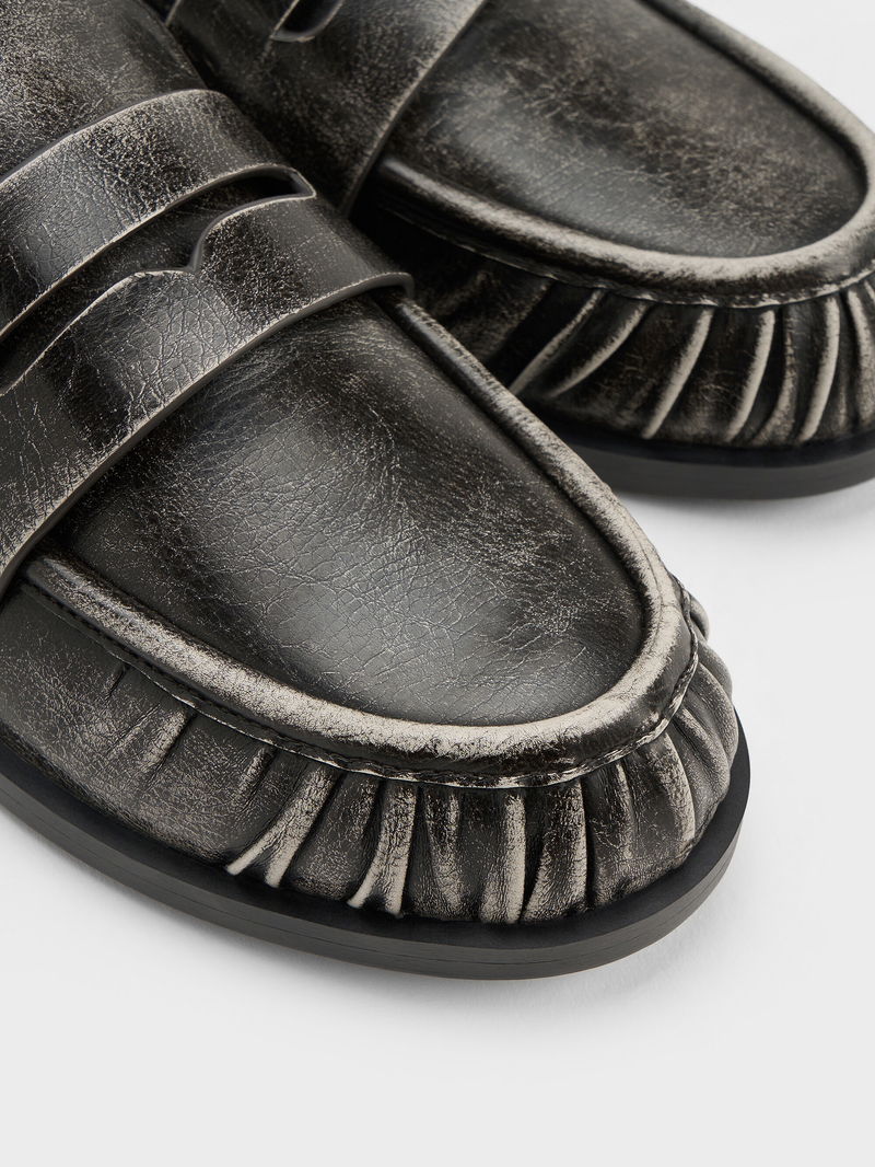 These Dylan loafer mules in grey feature a burnished finish, ruched detailing, classic penny straps, almond toes, and a slip-on design.