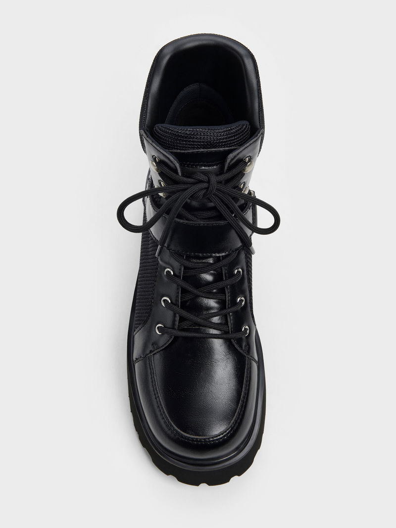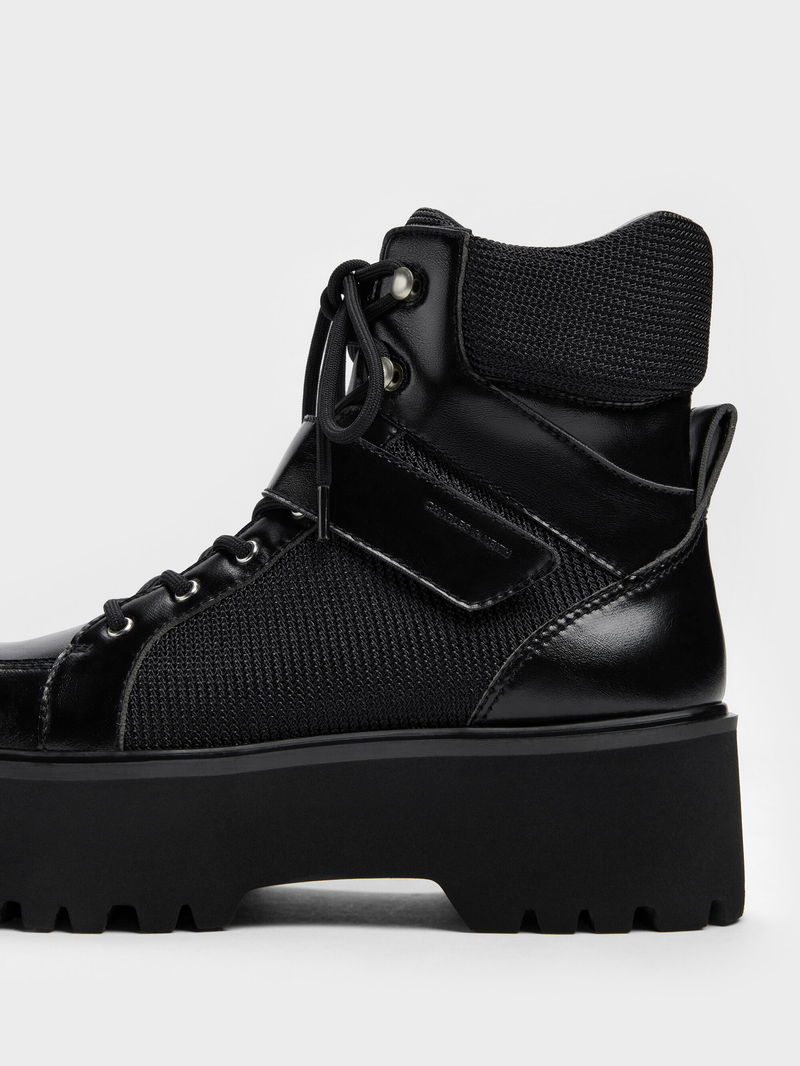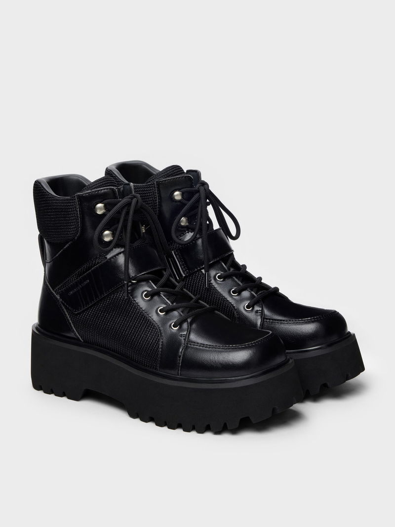 These Eliot combat boots in black feature chunky ridged platform soles for added traction, classic lace-up closures and adjustable velcro straps for a extra-secure fit. These edgy but versatile pair will match well with both dresses and jeans.
